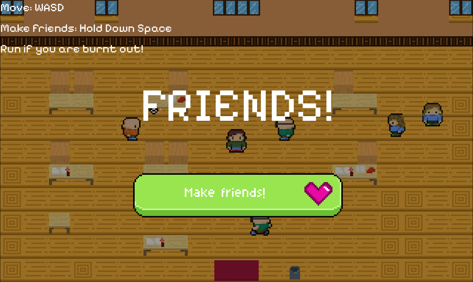 In Friends! you play as a child, desperate to make friends fast. But friends, especially so many, are not for everyone. Be careful of overwhelming attention from your new friends. The more friends you have, the worse it gets??
